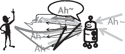 In robot audition, it is possible to perform self-generated sound suppression that utilizes the point that self-generated signals are known to the robot itself. Takeda et al., from a semi-blind separation technique based on ICA, have developed a function of self-generated sound suppression that estimates reverberation with self-generated utterances as already-known, suppresses the input sound mixture in self-generated utterances and extracts utterances of a partner in the situation shown in Figure2.3 [12].