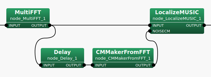 Given a sound source of LocalizeMUSIC  node, in order to suppress a specific sound source like noise, etc., it is necessary to prepare a correlation matrix that includes noise information beforehand. This node generates the correlation matrix for a sound source, at fixed period, from a multi-channel complex spectrum that is output from the MultiFFT  node. Suppressed sound source can be achieved by connecting the output of this node to the NOISECM input terminal of LocalizeMUSIC  node, assuming that information before a fixed period is always noise.