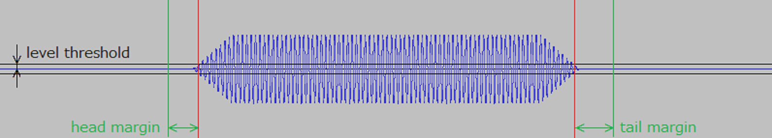 A frame in which both the amplitude level and the number of zero crossings of the acoustic signal exceed a threshold specified by a parameter is defined as a voice section start. In addition, as shown in Figure 6.150, margins can be provided at the beginning and end of the section.