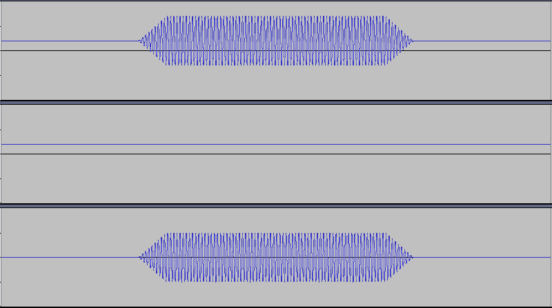 The upper part of the figure shows the input acoustic signal. The acoustic signal is a fade-in and fade-out of a 440 [Hz] Sin wave with an amplitude level of about $\pm {16000}$, but it is an example in which a direct current (DC) component is constantly included around + 6500.